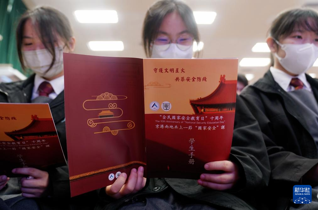 4月9日,在香港培僑中學,學生在“京港兩地共上一堂國安課”活動上閲讀學生手冊。新華社發(王申攝)