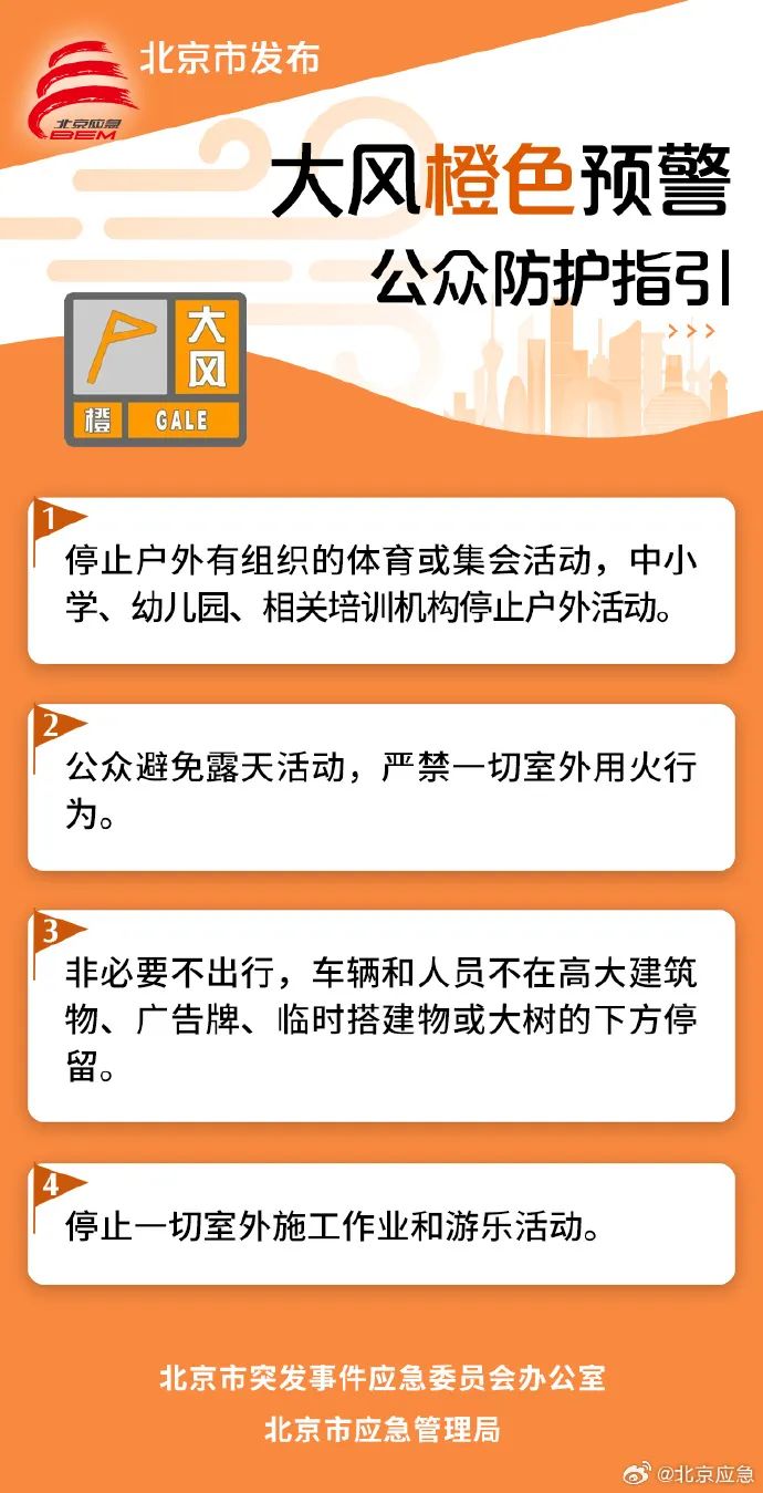 市應急辦發佈大風橙色預警公眾防護指引,其中提到,停止户外有組織的體育或集會活動,中小學、幼兒園、相關培訓機構停止户外活動。公眾避免露天活動,嚴禁一切室外用火行為。非必要不出行,車輛和人員不在高大建築物、廣告牌、臨時搭建物或大樹的下方停留。停止一切室外施工作業和遊樂活動。