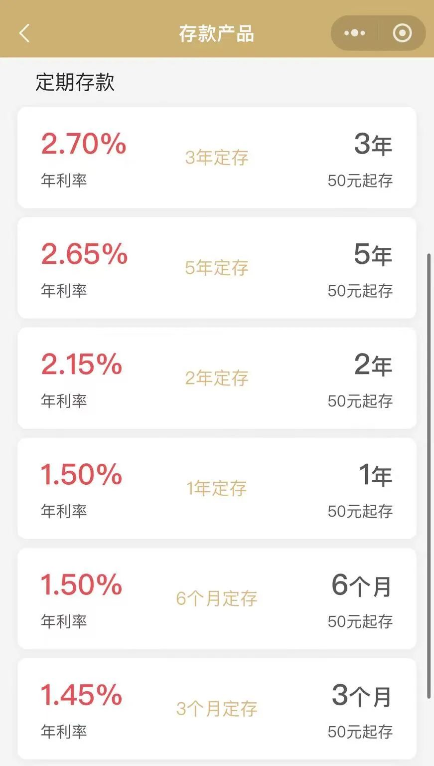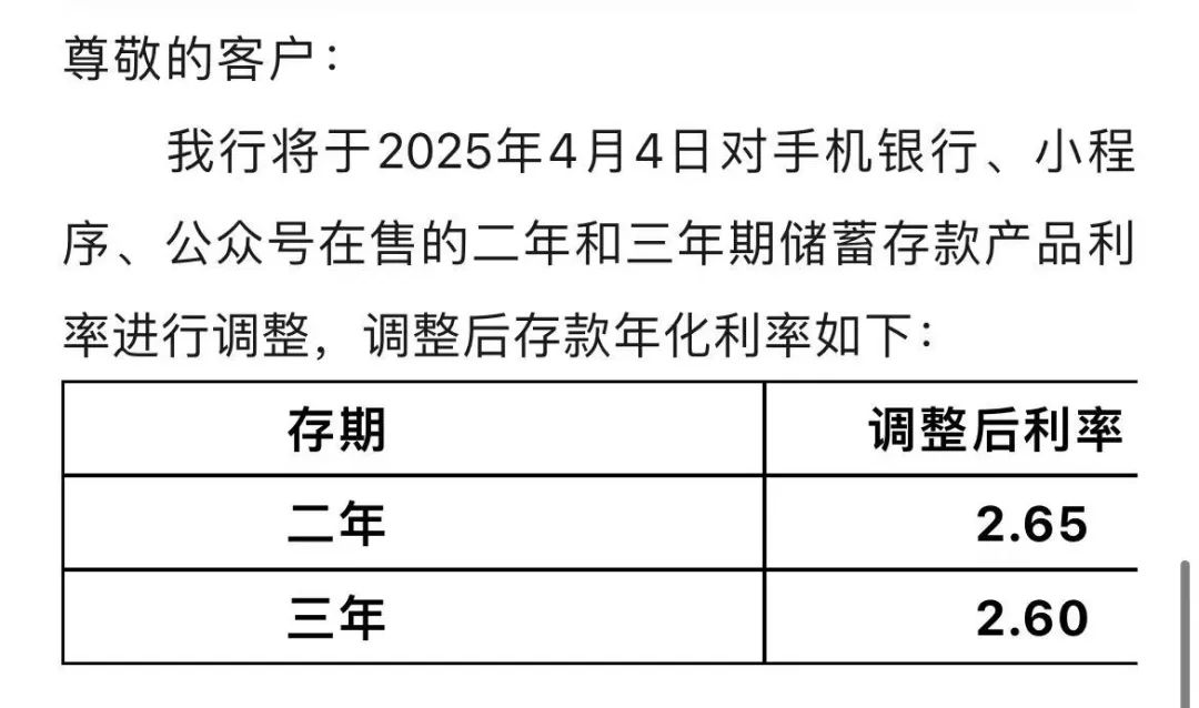 除了上述全國性股份制銀行,4月起,部分中小銀行也下調了存款產品利率。安徽新安銀行發佈公告稱,該行於4月4日對存款產品執行新的利率政策。調整後,兩年、三年存款利率分別為2.65%、2.60%,分別下調15個基點、20個基點。一年期、六個月、三個月定期存款利率維持不變。該行同樣出現兩年期、三年期存款利率倒掛的情況。