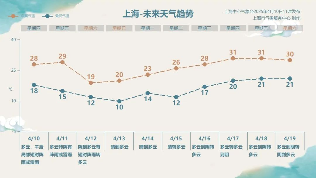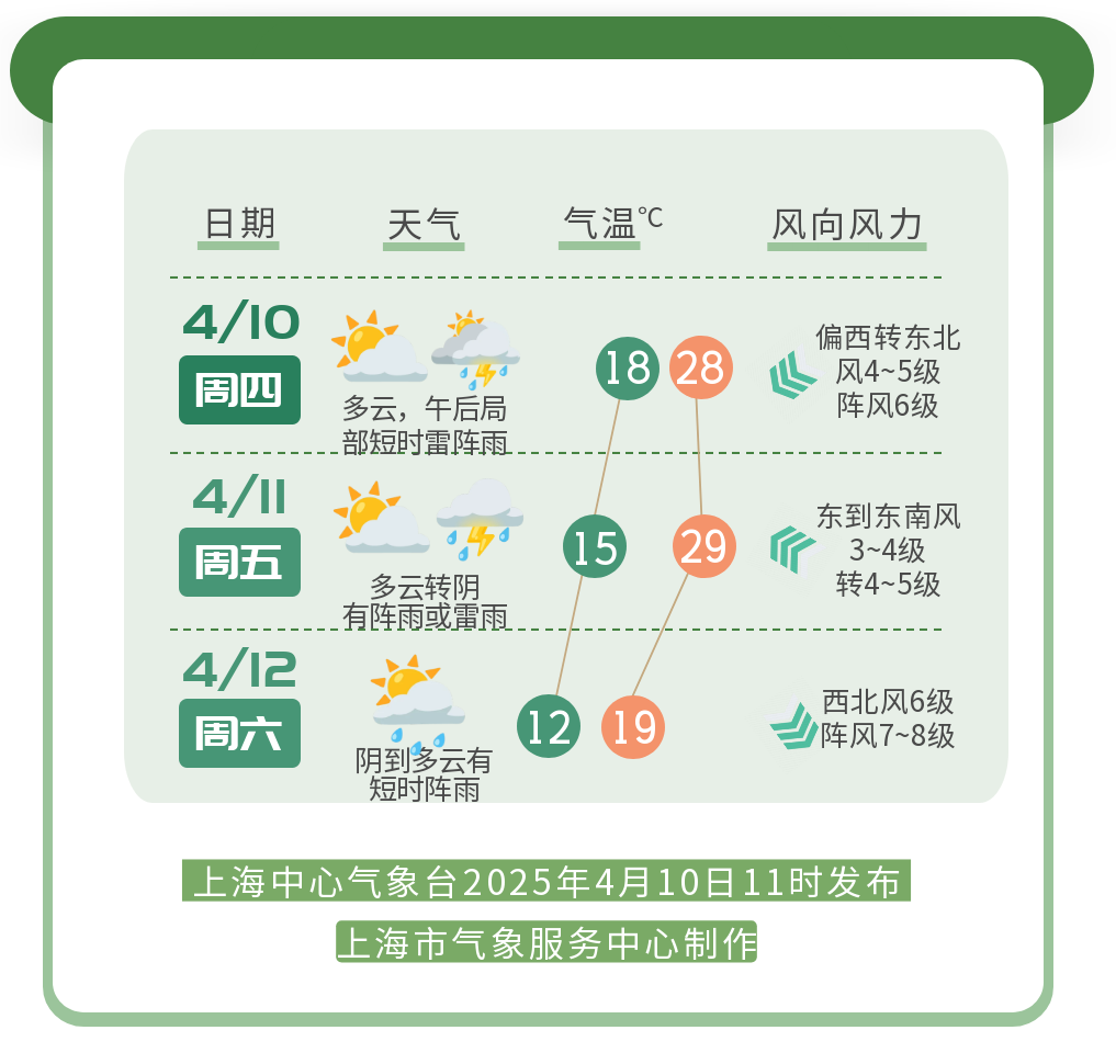 週五(11日)白天多雲,氣温仍較高,最高氣温29℃左右。週五夜間到週六上午有強對流天氣,伴有雷雨大風,雨量中到大雨,西部和北部大雨。冷空氣週日上午開始影響上海,預計週五至週日平均氣温降幅6~8℃; 週六和週日白天陸地最大陣風7~8級,沿江沿海地區和長江口區8~10級,洋山港區和上海市沿海海面9~11級。