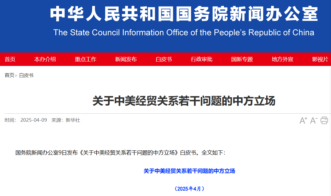 【環球網財經綜合報道】4月9日,國務院新聞辦公室發佈《關於中美經貿關係若干問題的中方立場》白皮書,白皮書深刻闡明中美經貿關係互利共贏本質,系統闡述中國踐行自由貿易理念、嚴格遵守世界貿易組織規則的堅定態度,呼籲美方通過平等對話和互利合作解決分歧,推動中美經貿關係健康穩定發展。