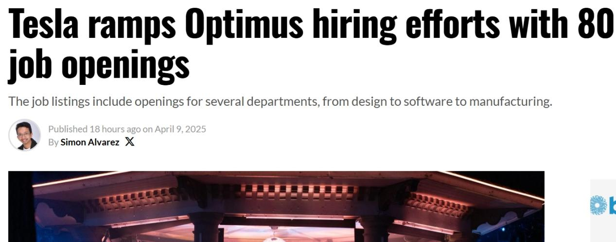 外媒:特斯拉2025年將生產首批Optimus ,正大力擴充機器人團隊