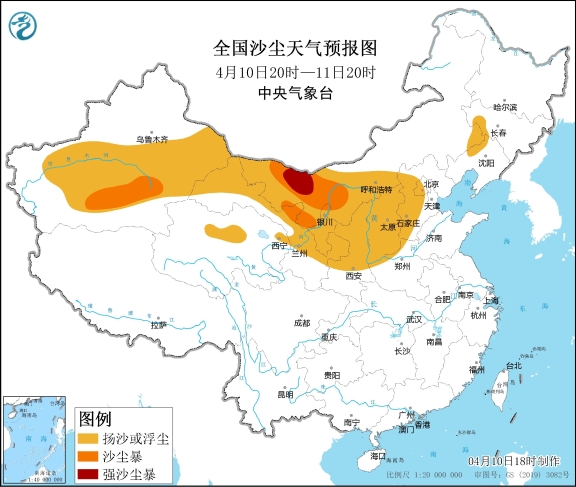 預計,4月10日20時至11日20時,新疆東部和南部、青海北部、內蒙古西部、甘肅、寧夏、陝西中北部、山西、河北西部、北京中西部等地有揚沙或浮塵天氣,其中新疆南部、內蒙古西部、甘肅西部等地的部分地區有沙塵暴,內蒙古西部局地有強沙塵暴。