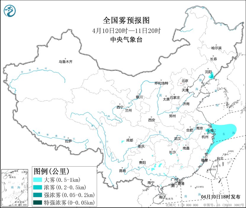 預計,4月10日夜間至11日白天,東海西部海域、長江口及杭州灣附近海域、浙江沿岸海域、舟山羣島附近海域、上海港、寧波港將有能見度不足1公里的大霧。此外,4月10日夜間至11日早晨,上海南部、浙江北部、遼寧東南部等地的部分地區有大霧,局地有能見度不足200米的強濃霧。