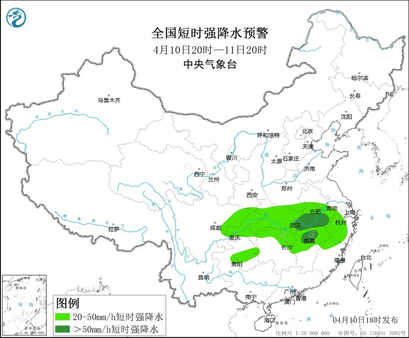 預計4月10日20時至11日20時,江漢東部、江淮西部、江南中東部等地的部分地區將有8級以上雷暴大風或冰雹天氣,其中,湖北東部、安徽南部、江西中北部、浙江西部等地的部分地區將有10級以上雷暴大風,最大風力可達11級以上;西南地區東部、江漢、江淮西部、江南北部等地的部分地區將有小時雨量大於20毫米的短時強降水天氣,其中,湖北東部、安徽南部、江西北部等地的部分地區小時雨量大於50毫米,最大可達60毫米以上。