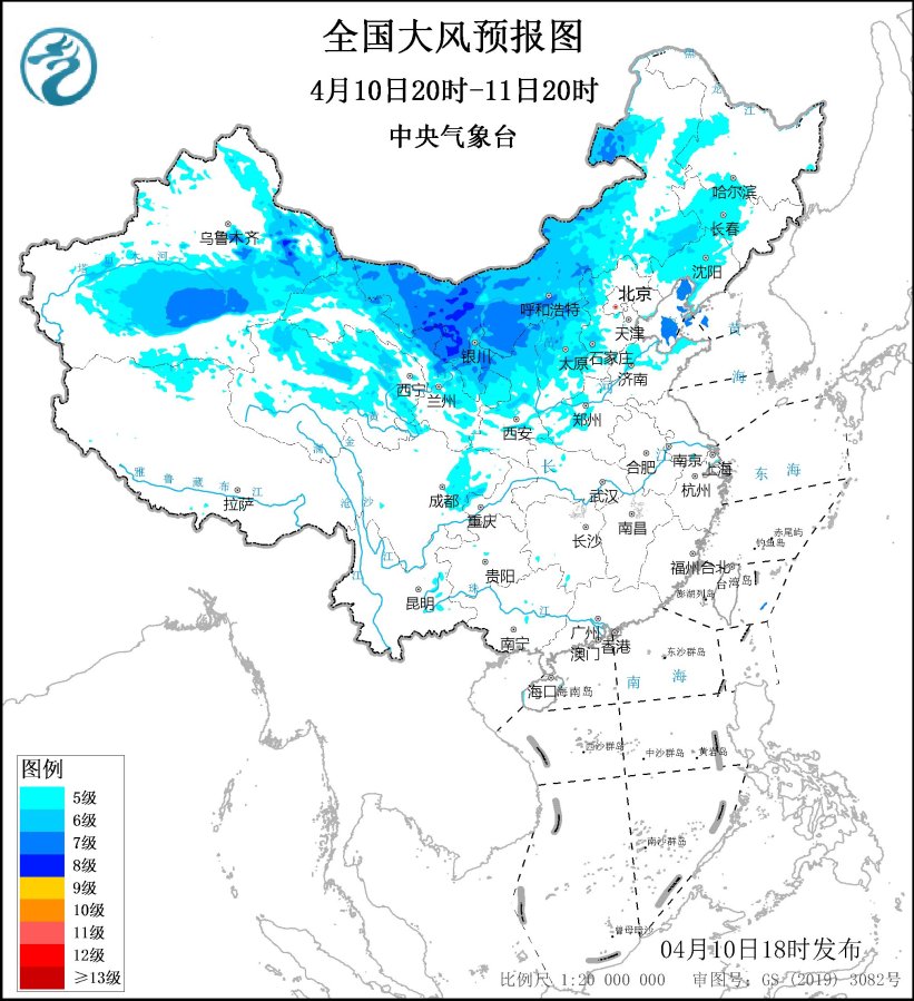 預計,4月10日20時至11日20時,新疆東部和南疆盆地、內蒙古大部、吉林中西部、遼寧大部、青海中北部、甘肅大部、寧夏、陝西中北部、山西、河北西部、山東北部、河南西部、四川盆地中部等地部分地區有5~7級大風,陣風8~10級,其中,內蒙古中西部、山西北部等地局地陣風風力可達12~13級;渤海、渤海海峽將有7級、陣風8~9級的大風。