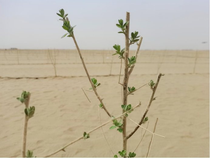 和田縣阿和公路西側羣眾治沙點位的大果沙棗冒出新芽。馬雯萱攝