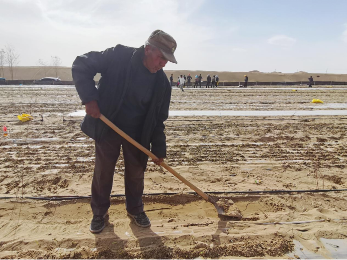 來自和田縣52歲的農户艾克木·買提克積極響應號召,自主申請治理沙地發展沙產業。他在阿和公路西側羣眾治沙點位承包了50畝地,種植大果沙棗,改良了土地,計劃後期套種桃子和杏樹。