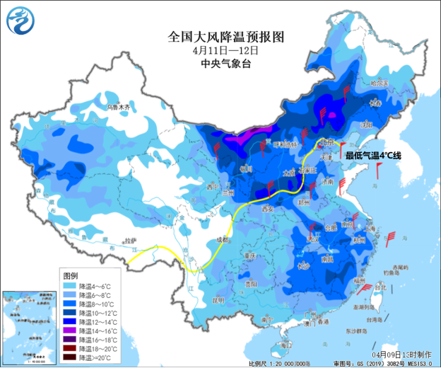 11日至12日,我國中東部大部地區氣温將普遍下降6至10℃,其中,西北地區東部、內蒙古中西部、華北西部和北部、江南東部等地局地降温幅度可達12至16℃;降温過後,最低氣温4℃線將位於河北北部、山西南部至甘肅南部一帶。
