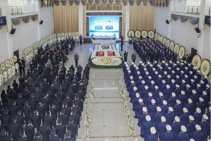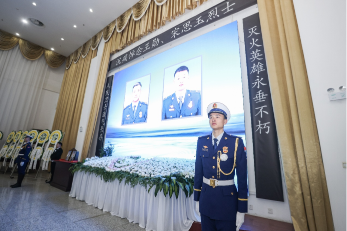 哀樂低迴、縞幔垂霜,寒松凝露、川嶽銜哀。回龍崗殯儀館禮堂內莊嚴肅穆。靈堂正前方懸掛着王勳、宋思玉烈士遺像,上方懸掛着黑底白字的橫幅“沉痛悼念王勳、宋思玉烈士”,莊重的黨旗覆蓋在英雄的棺槨上,周圍放滿了黃、白兩色菊花,4名消防禮兵肅然護衞在側。