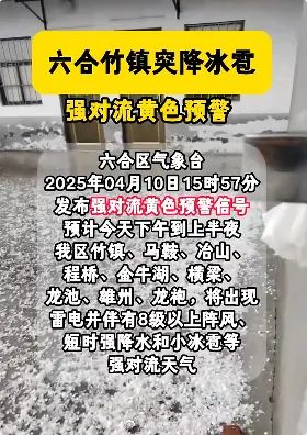 六合區氣象台4月10日15時57分發布強對流黃色預警信號:預計今天下午到上半夜,我區竹鎮、馬鞍、冶山、程橋、金牛湖、橫樑、龍池、雄州、龍袍將出現雷電並伴有8級以上陣風、短時強降水和小冰雹等強對流天氣。