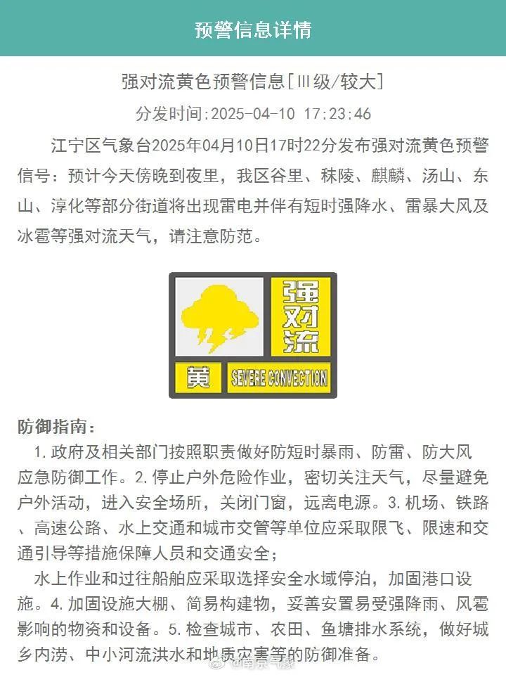 江寧區氣象台4月10日17時23分發布強對流黃色預警信號:預計今天傍晚到夜裏,我區谷里、秣陵、麒麟、湯山、東山、淳化等部分街道將出現*雷電並伴有短時強降水、雷暴大風及冰雹等強對流天氣,*請注意防範。