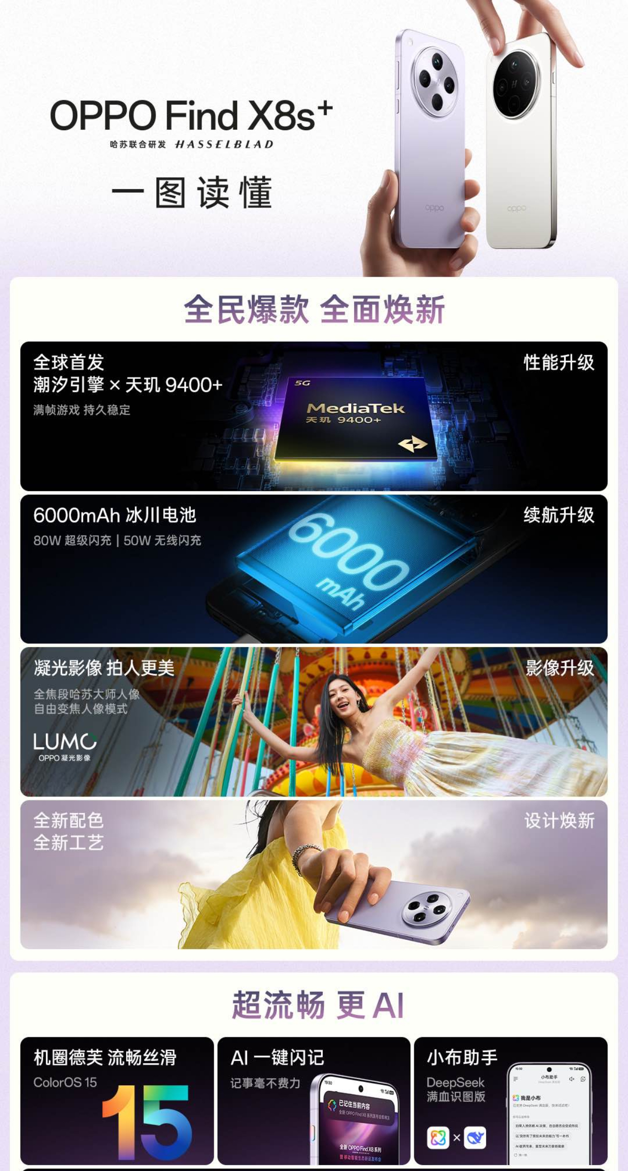 作為OPPO Find X8的升級版,6.6 英寸的Find X8s⁺ 在芯片、影像、續航方面全面升級。性能上,Find X8s+ 同樣搭載天璣9400+芯片與LUMO凝光影像系統,支持全焦段哈蘇人像,並搭載了更大的6000mAh冰川電池。