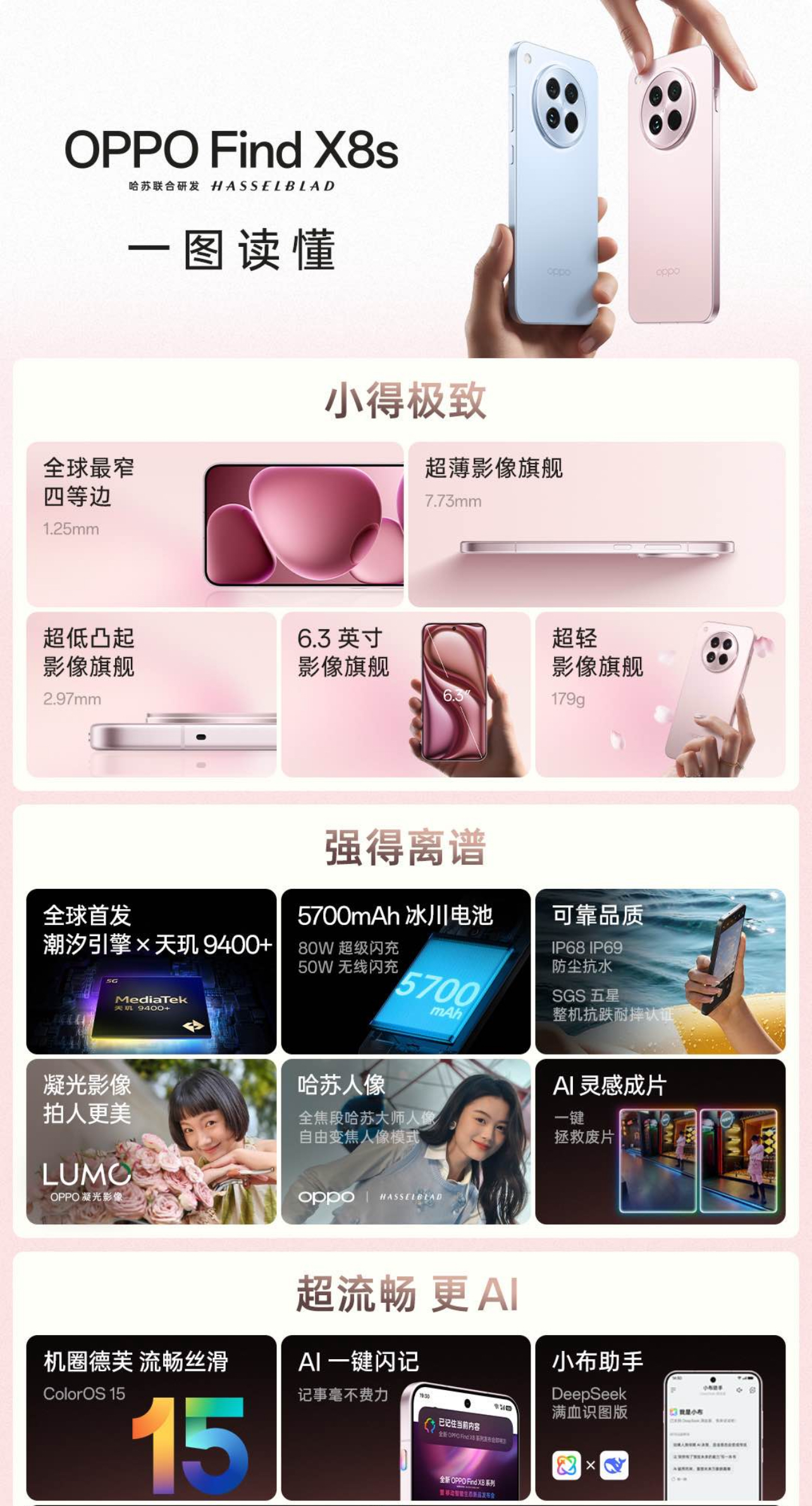 【環球網科技綜合報道】4月10日,OPPO正式發佈全新Find X8系列產品,包括Find X8s和Find X8s+。其中,輕薄小直屏 Find X8s帶來1.25mm四等邊的極致設計和179g的超輕重量,首發天璣9400+旗艦芯片和OPPO潮汐引擎的性能組合,集成5700mAh超大冰川電池以及80W超級閃充和50W無線閃充;搭載全新OPPO LUMO凝光影像系統和超光影三主攝的組合,Find X8s的ColorOS 15,結合Find X8系列全新的快捷按鍵,帶來首個AI 一鍵閃記能力。