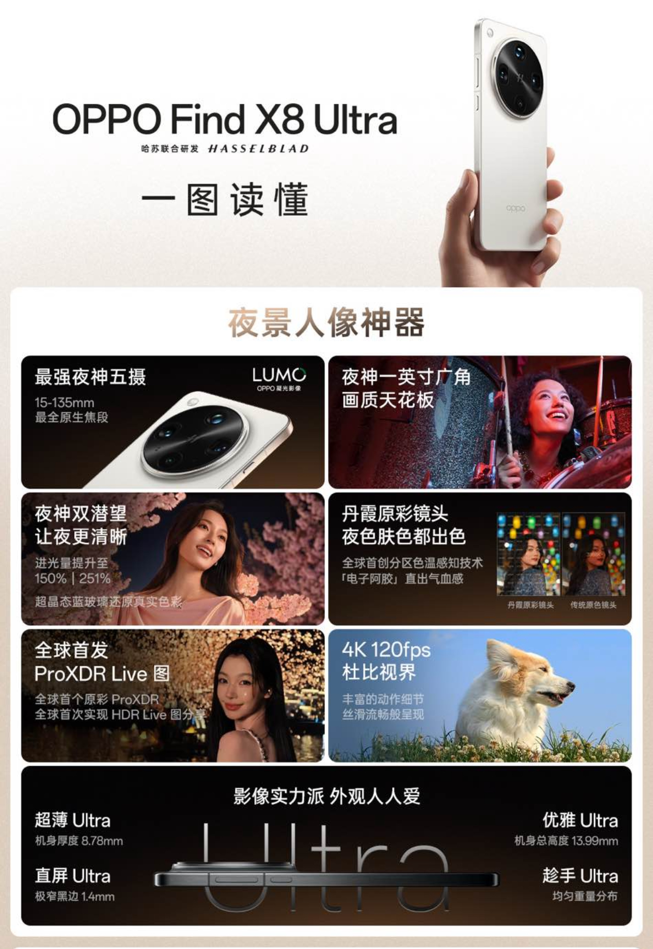 【環球網科技綜合報道】 4月10日,OPPO 發佈年度影像旗艦 Find X8 Ultra,採用超輕薄直屏設計,搭載全新OPPO LUMO 凝光影像系統和夜神五攝影像系統,包括首個分區色温感知鏡頭 —— 丹霞原彩鏡頭,改變了夜景人像拍攝的清晰度與色彩表現。Find X8 Ultra 還帶來首個原彩 ProXDR 和原彩 ProXDR 實況照片,並將支持 HDR Live 圖在小紅書的分享。