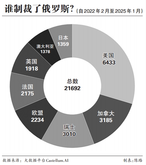 誰對俄製裁的數量更多呢?從俄烏衝突爆發至2025年1月,美國已對俄羅斯實施近6500項制裁,為對俄製裁數量最多的單一國家。緊隨其後的是加拿大,實施了超過3000項制裁。歐盟以及歐洲國家的制裁總數比美國更多。歐盟共對俄羅斯實施了超過2000項制裁。按照單一國家來看,“中立的”瑞士實施了約3000項對俄製裁,法國和“脱歐”的英國又都單獨實施了2000項左右。