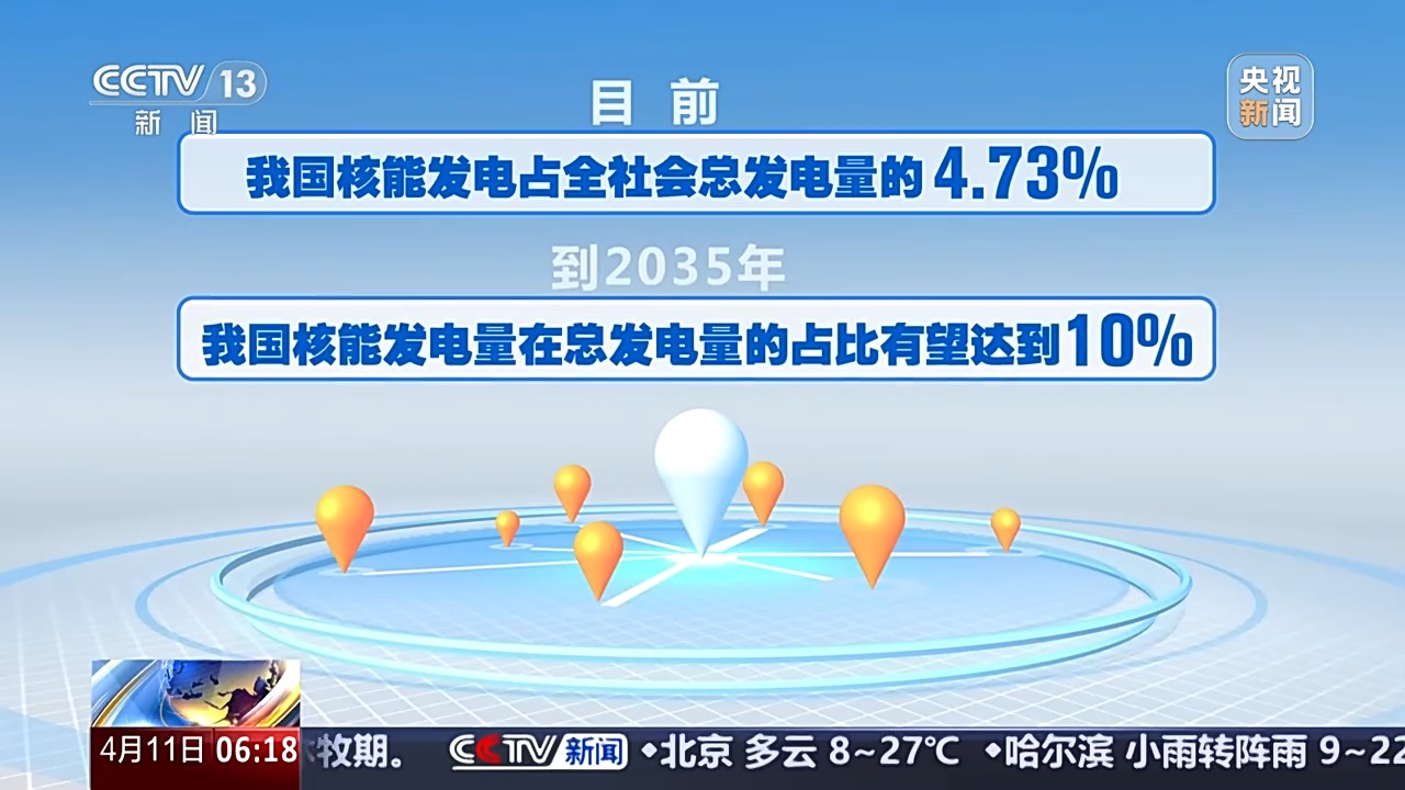 目前我國核能發電佔全社會總髮電量的4.73%,到2035年,我國核能發電量在總髮電量的佔比有望達到10%,相比2022年翻倍。(總枱央視記者 朱江 古峻嶺 宋建春 王坤)
