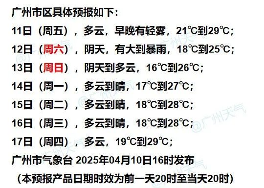 廣州市氣象台預計,4月11日廣州仍以多雲為主。4月12日早晨到下午,受冷空氣、切變線和高空槽影響,廣州有大到暴雨,並伴有8~10級短時大風、雷電、短時強降水(30~50毫米)、局地小冰雹等強對流天氣, 強降水的主要落區為花都、從化、增城;氣温小幅下降。