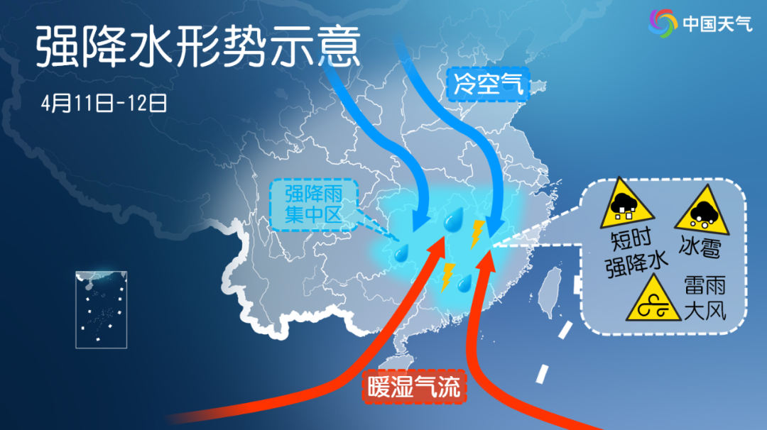 4月11日晚至13日,廣東省將出現大範圍強對流天氣,有8級至10級(局地12級)雷暴大風、強降水和局地冰雹。 粵北和珠三角地區有大雨到暴雨,局部大暴雨。
