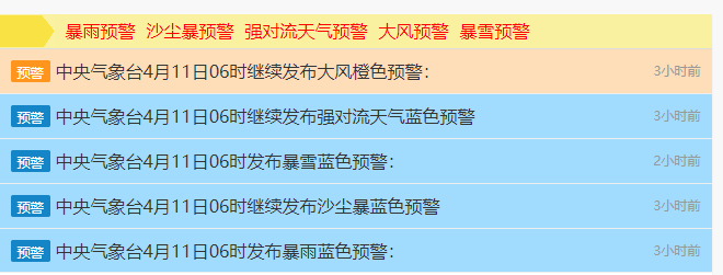 中央氣象台4月11日06時發佈沙塵暴藍色預警、暴雨藍色預警、強對流天氣藍色預警、大風橙色預警、暴雪藍色預警。