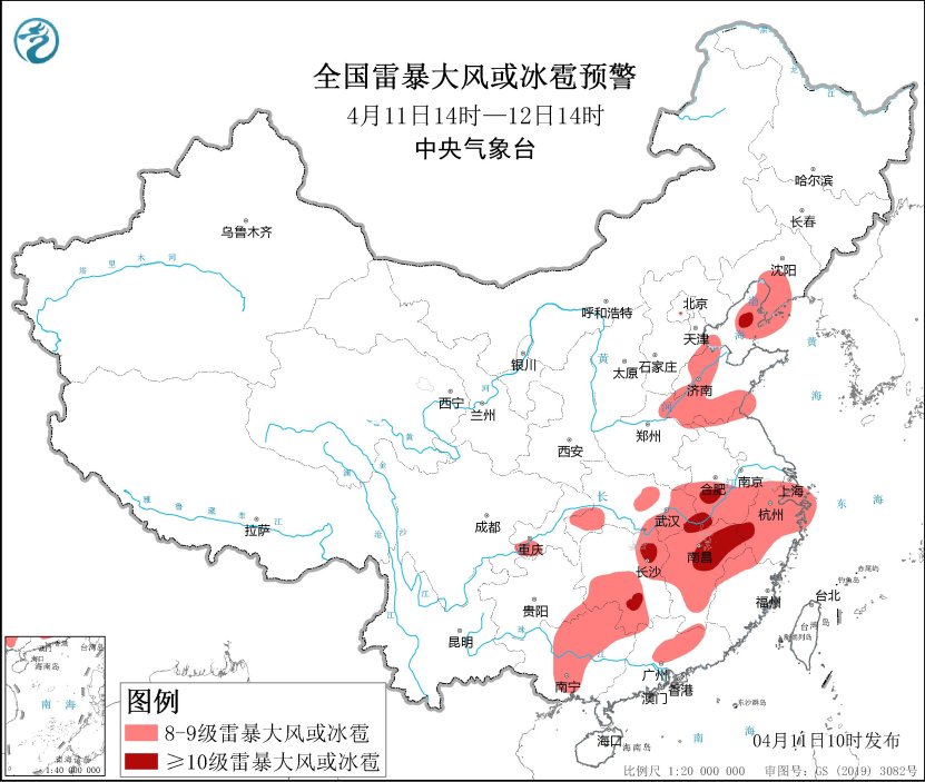 預計4月11日14時至12日14時,西南地區東部、江漢東部、江淮西部、江南、華南、東北地區南部、黃淮東北部等地的部分地區將有8級以上雷暴大風或冰雹天氣,其中,安徽中部、湖北東部、湖南東北部和南部、江西北部、浙江西部以及渤海中東部、東海東北部等地的部分地區將有10級以上雷暴大風,局地可達11-12級,最大風力可達12級以上;西南地區東部、江漢南部、江淮中西部、江南、華南、東北地區東南部、黃淮東北部等地的部分地區將有小時雨量大於20毫米的短時強降水天氣,其中,安徽中部、湖北東部和南部、湖南中部、江西中部、福建西北部、貴州東南部等地的部分地區小時雨量大於50毫米,最大可達80毫米以上。