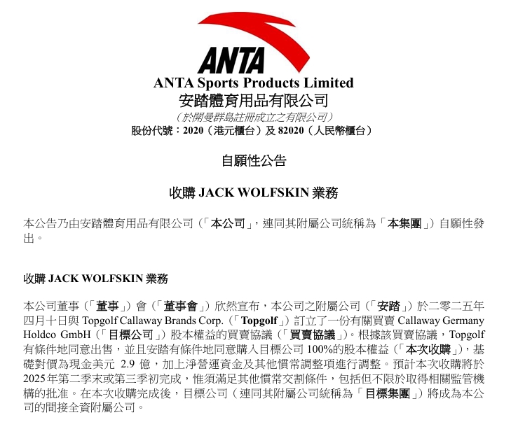 根據協議,Topgolf有條件地同意出售,安踏有條件地同意購入目標公司100%的股本權益,基礎對價為現金美元 2.9 億,加上淨營運資金及其他慣常調整項進行調整。預計本次收購將於2025年第二季末或第三季初完成,須滿足其他慣常交割條件,包括但不限於取得相關監管機構的批准。