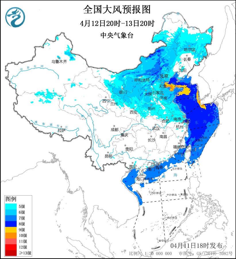 4月12日20時至13日20時,西北地區東北部、內蒙古、華北、黃淮、江淮及東北地區北部和西部等地有5~7級大風,陣風8~9級,其中,內蒙古中部、河北北部、北京西部和北部山區等地局地陣風可達10~11級;渤海、渤海海峽、黃海大部海域、東海大部海域、台灣海峽、台灣以東洋麪、南海北部海域、北部灣將有7~8級、陣風9~10級的大風,其中渤海南部海域、黃海北部和中部海域風力可達9~10級、陣風11~13級。