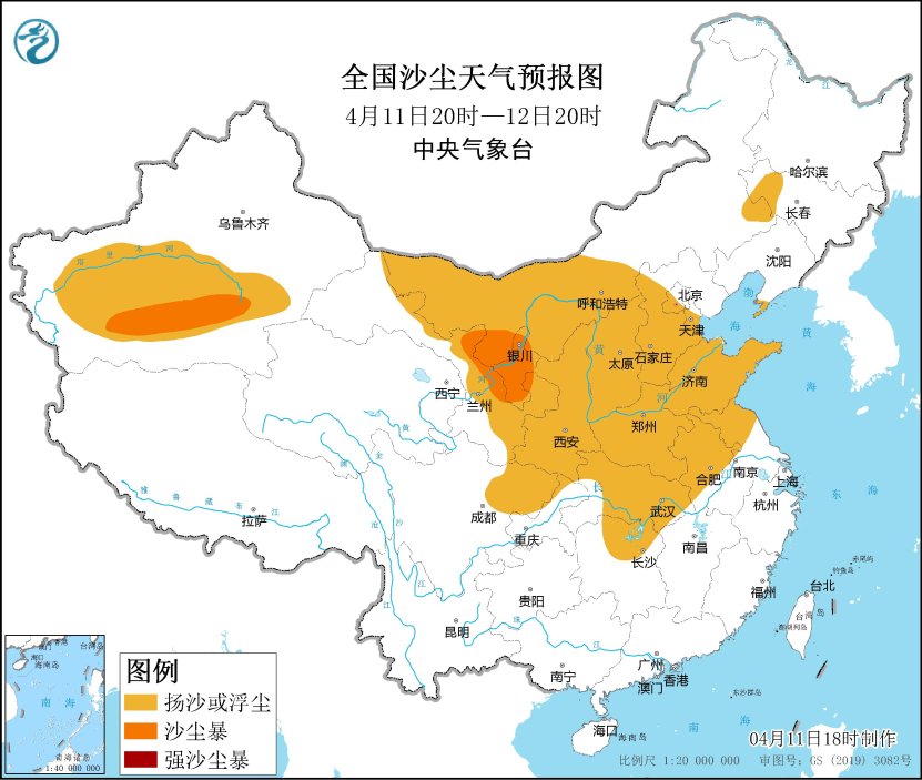 受冷空氣大風影響,預計4月11日20時至12日20時,內蒙古西部、新疆南部、甘肅中東部、寧夏、陝西、山西、河北中南部、北京西部和南部、天津中南部、山東、河南、安徽中北部、江蘇北部、湖北、湖南北部、四川盆地中北部、吉林西部等地的部分地區有揚沙或浮塵天氣,其中,內蒙古西部、新疆南部、甘肅中部、寧夏等地的局部地區有沙塵暴。