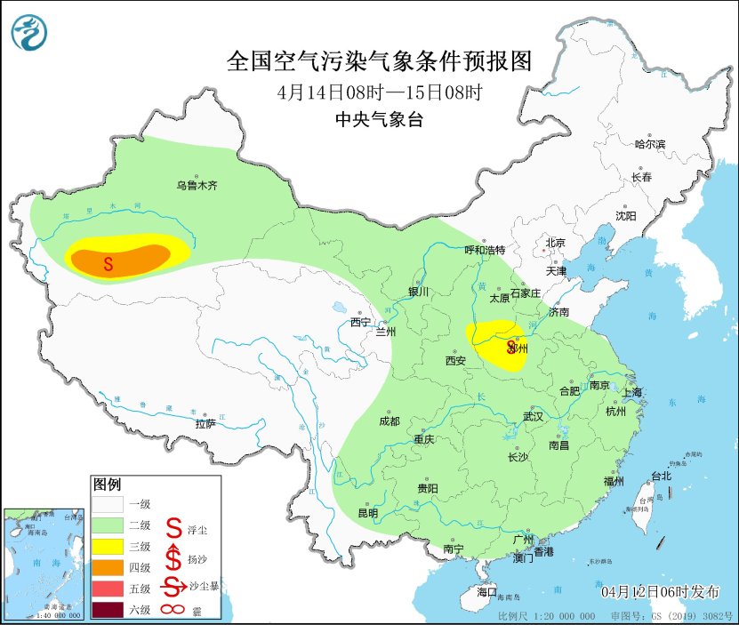 4月12日08時至13日08時,內蒙古西部、新疆南部、甘肅中東部、寧夏中南部、陝西中南部、山東東部和南部、河南、安徽、江蘇、上海、湖北、湖南、廣西北部、江西北部、浙江中北部、四川盆地中北部等地的部分地區有揚沙或浮塵天氣,其中,新疆南部等地局部有沙塵暴。中央氣象台4月12日06時繼續發佈沙塵暴藍色預警*。*