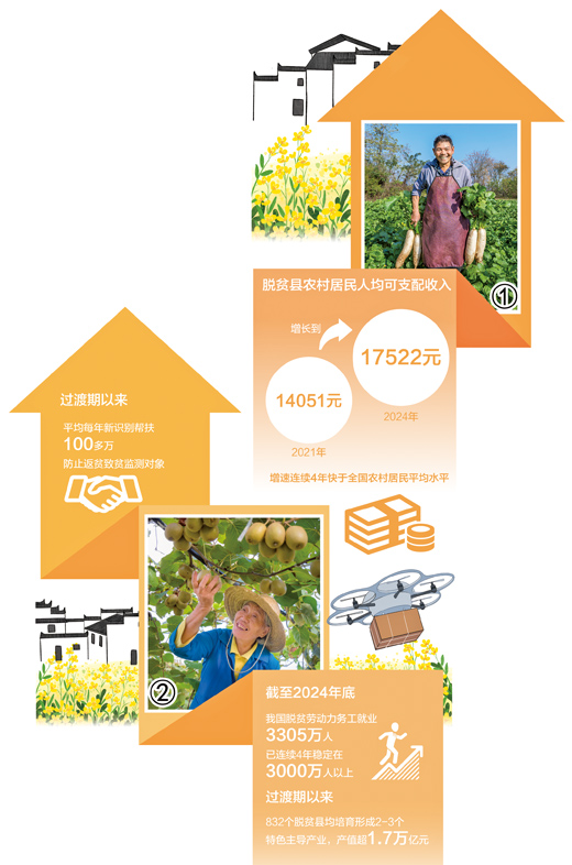經過4年多接續幫扶,脱貧縣基礎設施和公共服務持續改善,農村居民人均可支配收入從2021年的14051元增長到2024年的17522元,增速連續4年快於全國農村居民平均水平,脱貧地區與其他地區發展差距、脱貧人口與全國農民收入差距持續縮小,脱貧基礎更加穩固、成效更可持續。