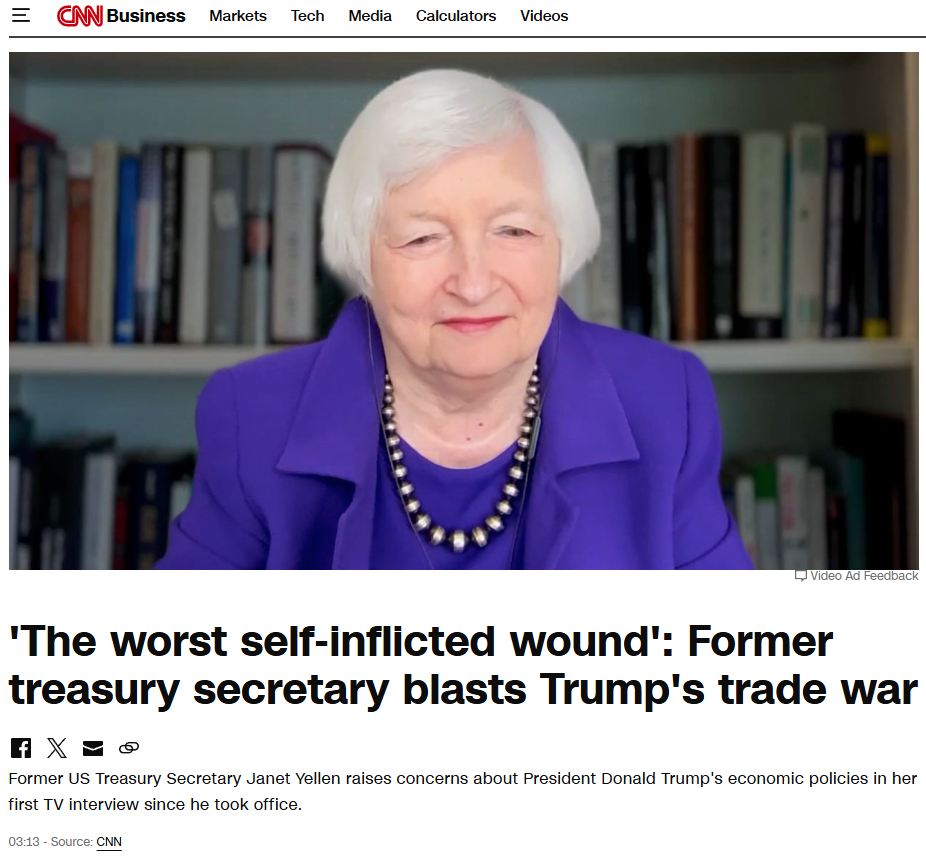 耶倫認為,美國的政策顯著增加了美國經濟衰退的風險,這是她所見過的“最嚴重的自我傷害”行為,會對全球經濟產生深遠影響。