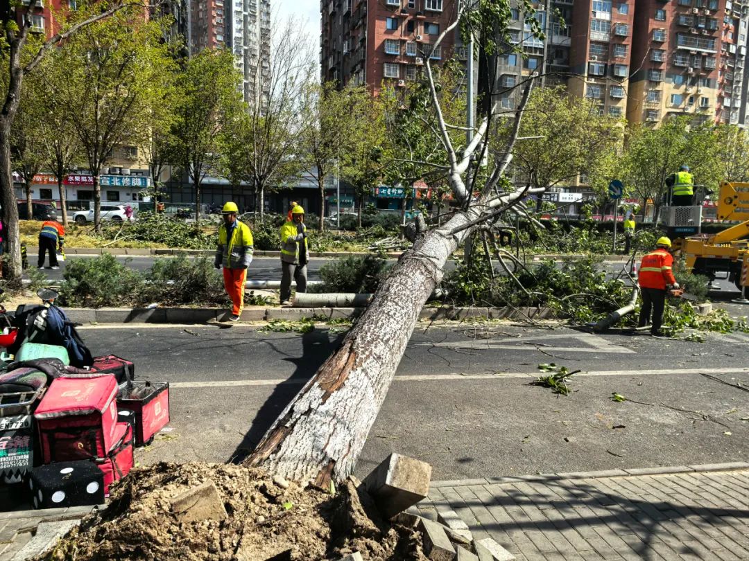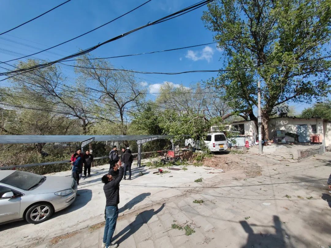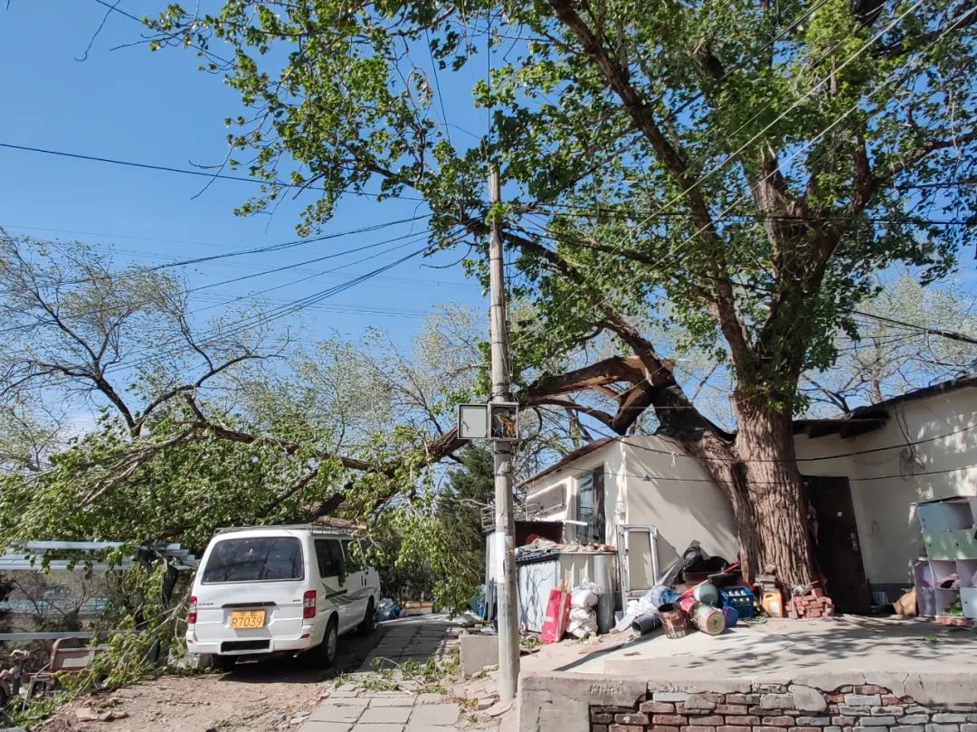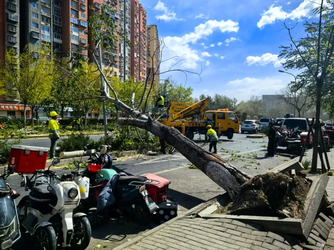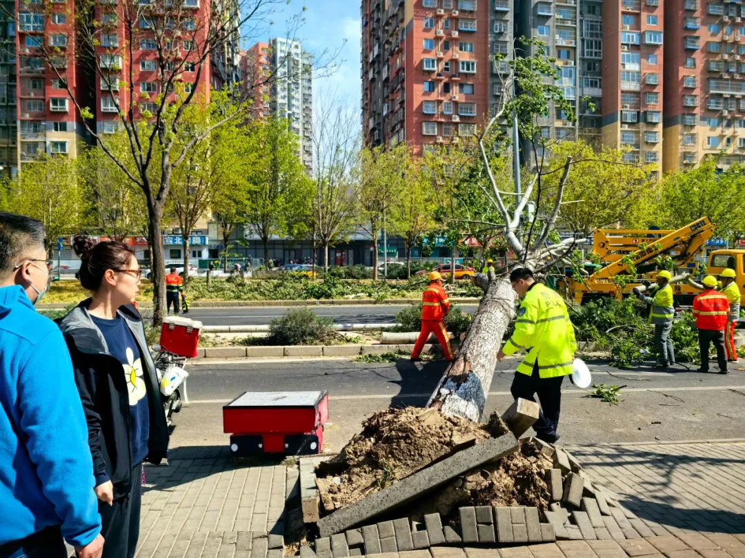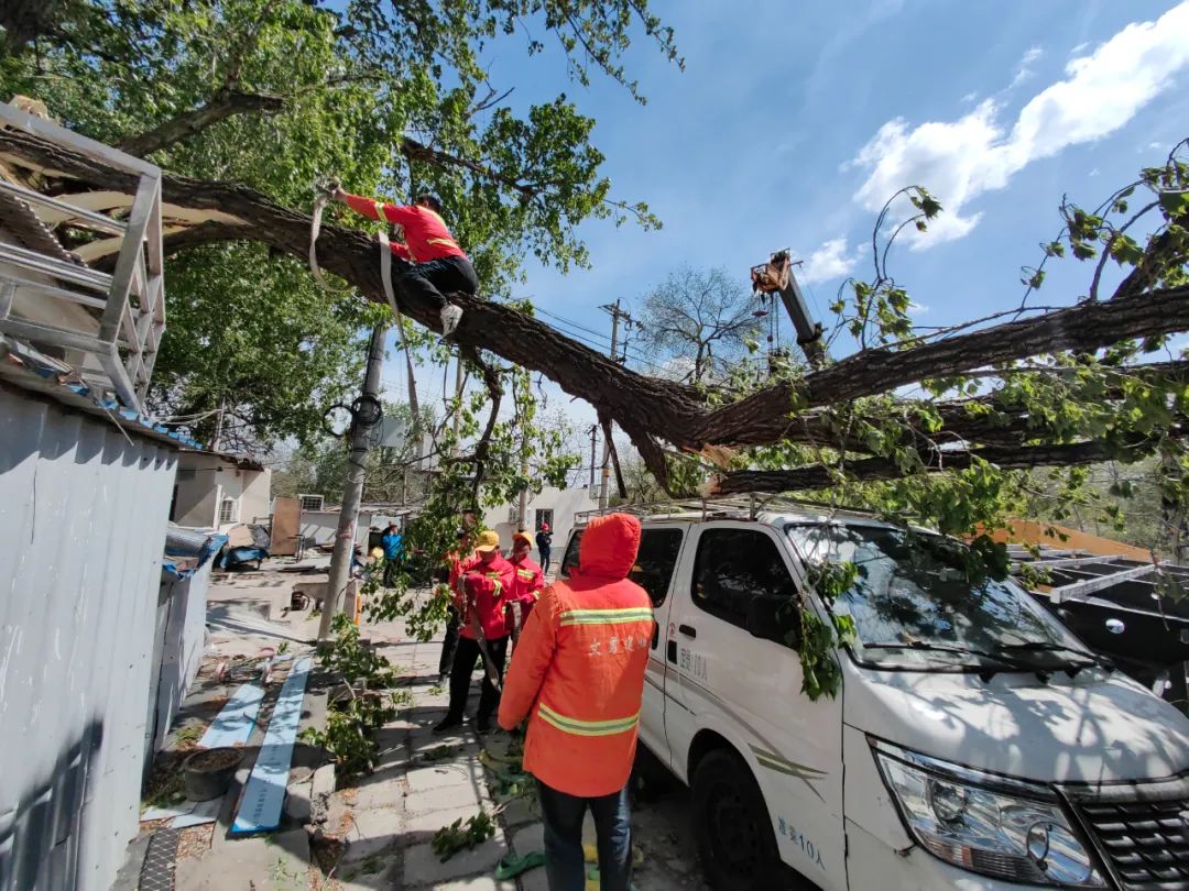 4月12日早上,石景山區蘋果園街道邊府社區城建四衞生院平房區發現樹木倒伏情況。直徑約六七十釐米的樹枝被大風吹折。街道第一時間聯繫電力部門,因壓到高壓電線,電力部門現場研判後確定需斷電後再進行應急處置。