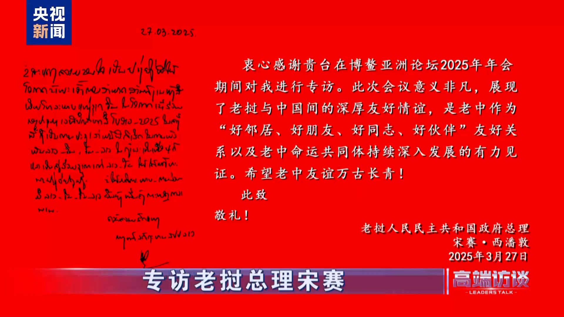 在專訪中,宋賽總理回憶了小時候在中國求學的經歷,以及中老兩國人民之間的深厚情誼。他稱讚中國為老撾、為世界的發展賦能。展望未來,他期待兩國能在數字經濟、清潔能源、人工智能等領域開展更多合作,續寫“山水相連、民心相通”的友誼新篇章。