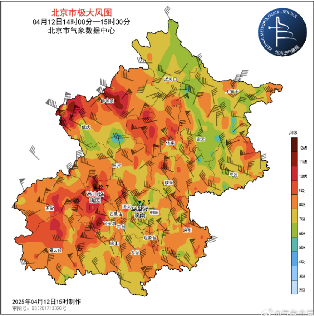 全市最大陣風風速:高山站門頭溝高山玫瑰園42.7米/秒(14級);平原地區昌平上西市29.9米/秒(11級)。