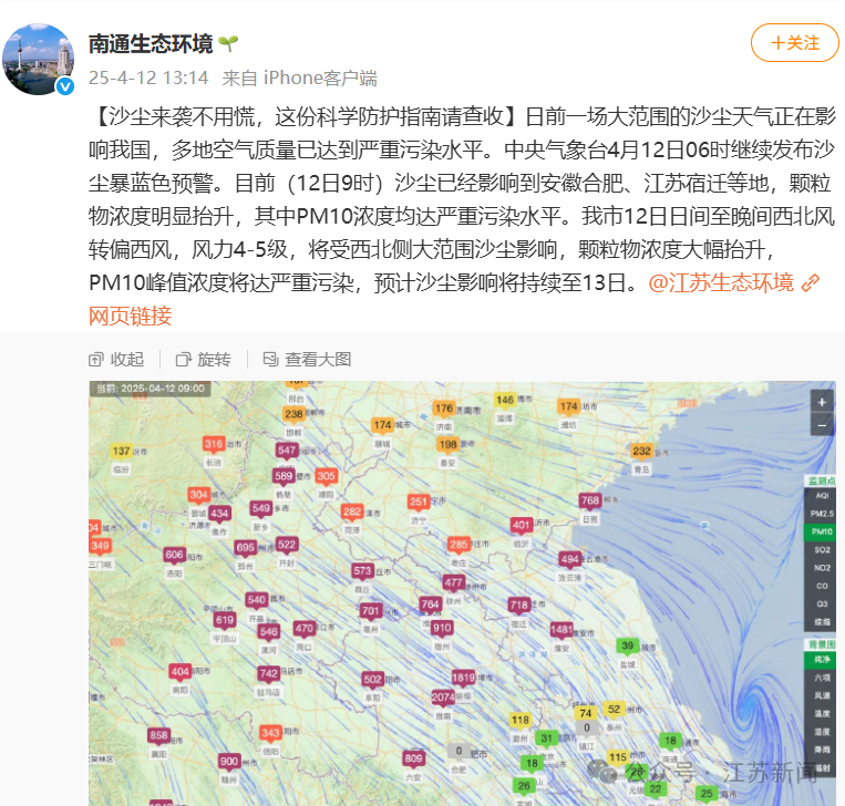 據@南通生態環境,南通市12日日間至晚間西北風轉偏西風,風力4-5級,將受西北側大範圍沙塵影響,顆粒物濃度大幅抬升,PM10峯值濃度將達嚴重污染,預計沙塵影響將持續至13日。