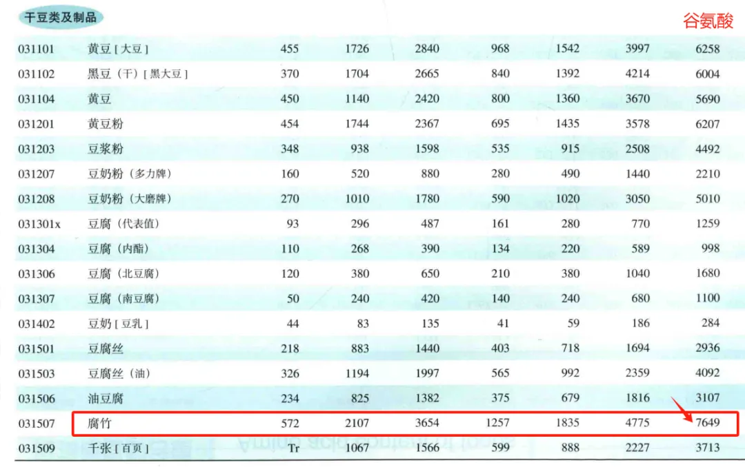 腐竹中的穀氨酸也不少,每 100g 幹腐竹含有 7649mg,是其他豆類或動物性食物的 2-5 倍。穀氨酸在大腦活動中起到重要的作用。