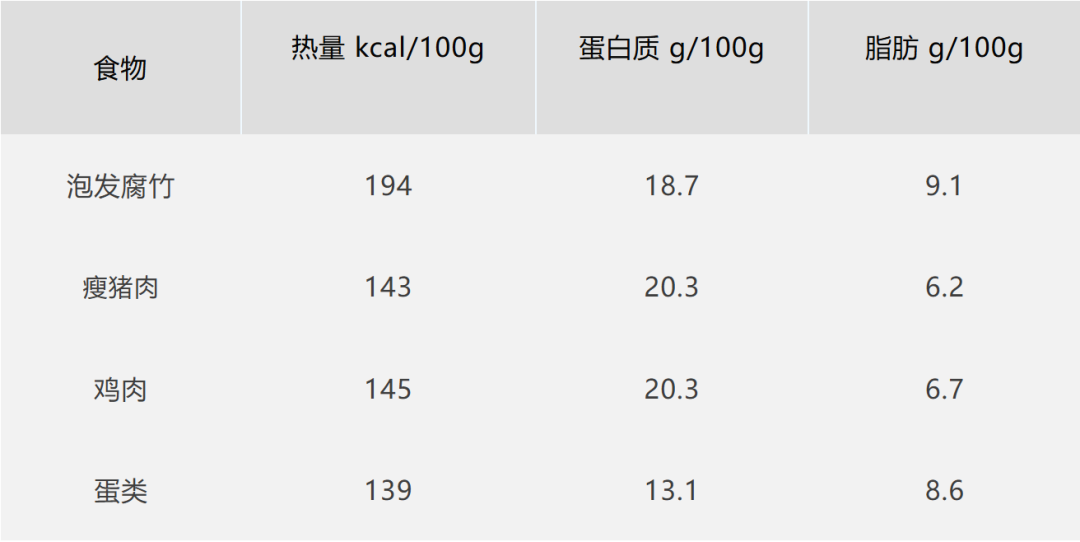 泡發後的腐竹蛋白質含量媲美肉類,比豬肉(蛋白質為 15.1g/100g)還要高,屬於高蛋白食品(每 100g 食物中蛋白質超過 12g)。