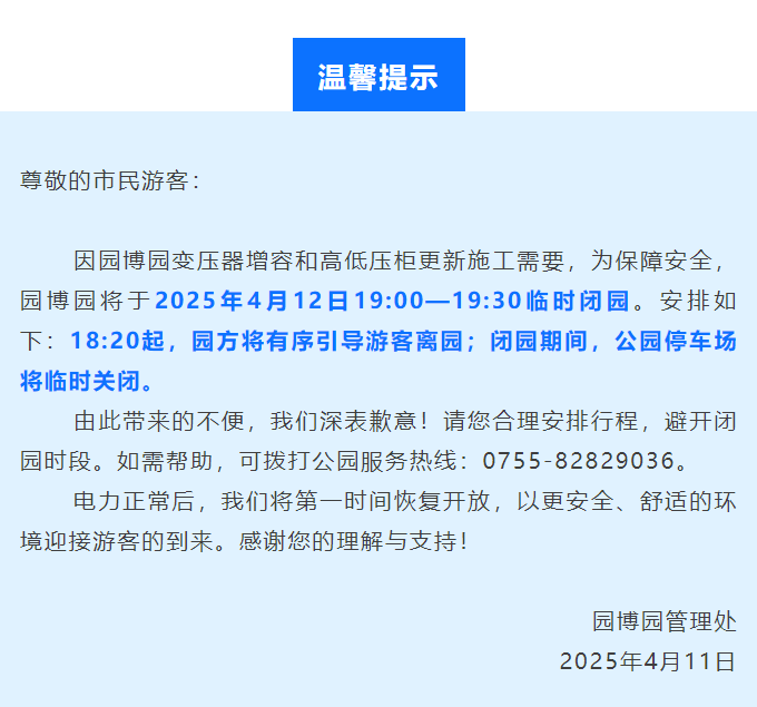 因園博園變壓器增容和高低壓櫃更新施工需要,為保障安全,*園博園將於2025年4月12日19:00—19:30臨時閉園。*安排如下:18:20起,園方將有序引導遊客離園;閉園期間,公園停車場將臨時關閉。