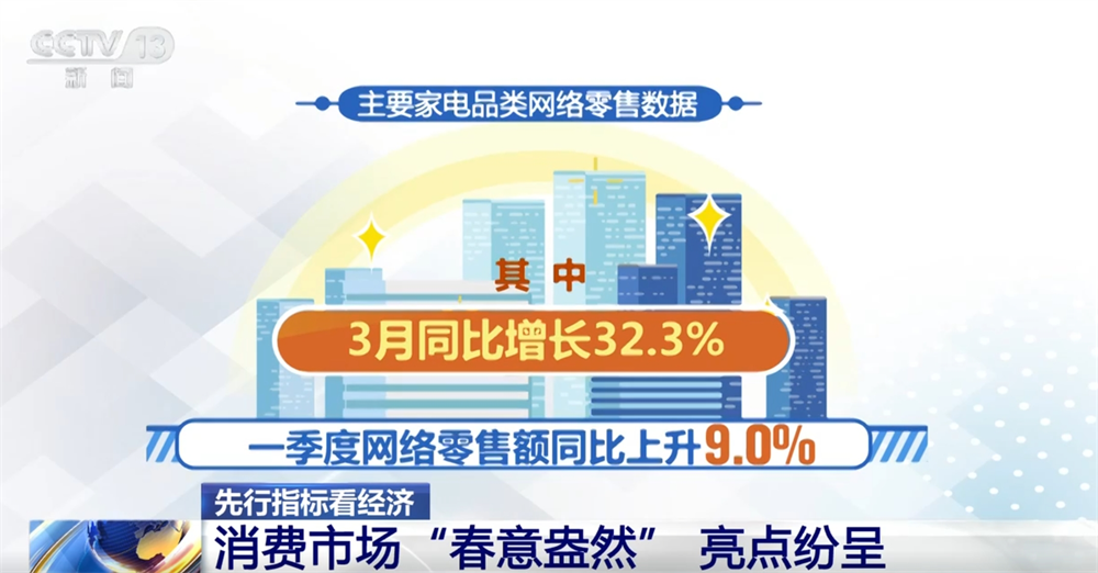 此外,“以舊換新”政策持續顯效。國家信息中心監測主要家電品類網絡零售數據顯示,一季度網絡零售額同比上升9.0%。其中3月同比增長32.3%,顯示春季家裝旺季帶動家電換新需求正加快釋放。