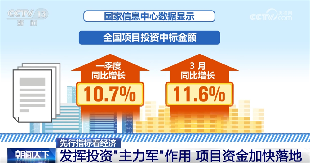 央視網消息: 今年以來,隨着各項宏觀政策繼續加力顯效,我國經濟呈現多點發力、向“新”而行的良好態勢。國家信息中心最新發布的一系列先行指標顯示,一季度我國經濟開局穩、成色足。首先,我們來看投資。今年以來,投資引擎動能增強,重大項目資金保障有力,呈現“政策靠前發力、項目加快推進”的特徵。