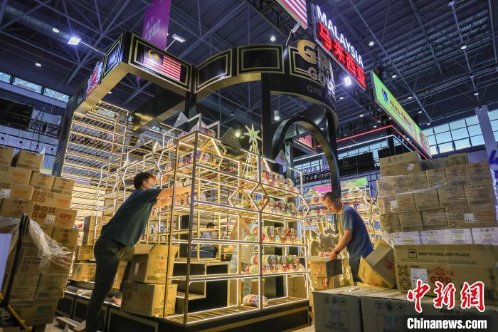 4月11日,第五屆中國國際消費品博覽會即將開展,馬來西亞館的展商在佈置展品。中新社記者 駱雲飛 攝
