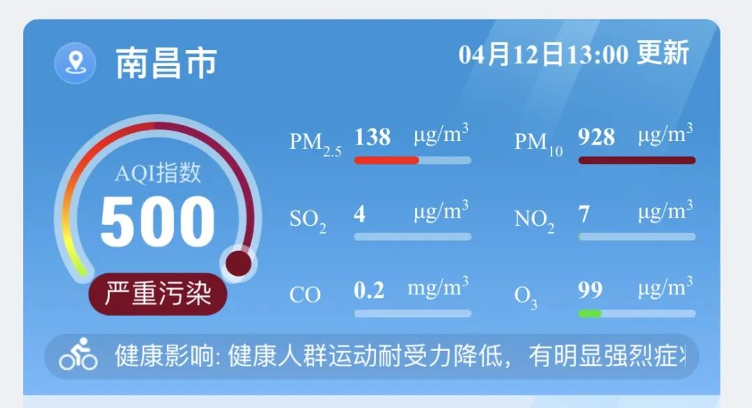 另外,江西省環境質量信息發佈平台的數據顯示,截至下午5點35分,南昌的即時空氣質量指數已經達到了434,PM10達到了每立方米534微克,屬於嚴重污染。