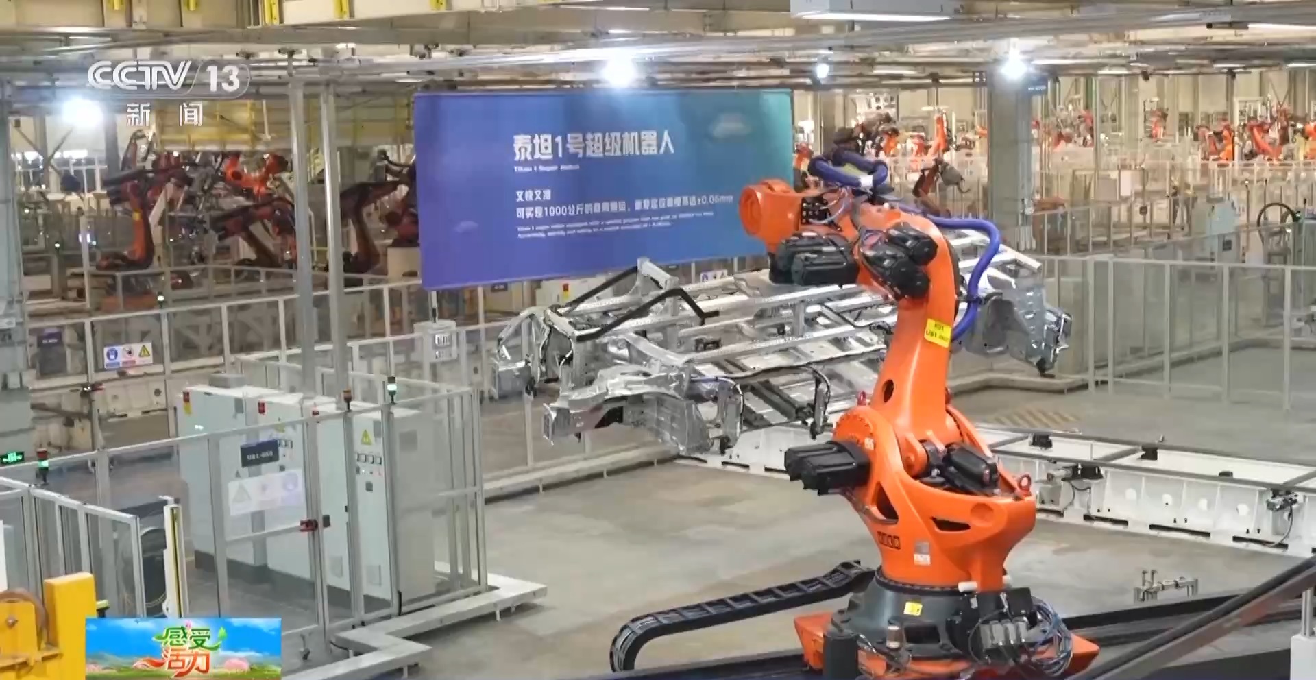 *超級工廠製造部副部長 張東臣:*這是車間最大的一個重載機器人,叫“泰坦一號”,能夠抓取一噸的重量。它可以精準和安全地搬運重型部件和組件,速度快、加速度靈活,伸展距離達6.4米,精度卻能達到髮絲級。別看它是個大力士,但是手腳非常精細,它能夠保證0.06毫米的抓取精度。