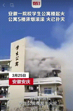 2025年3月25日,安徽省安慶市一高校學生公寓5樓發生火災。所幸消防救援及時,未造成人員傷亡。目前,學校正配合消防部門調查火災原因。
