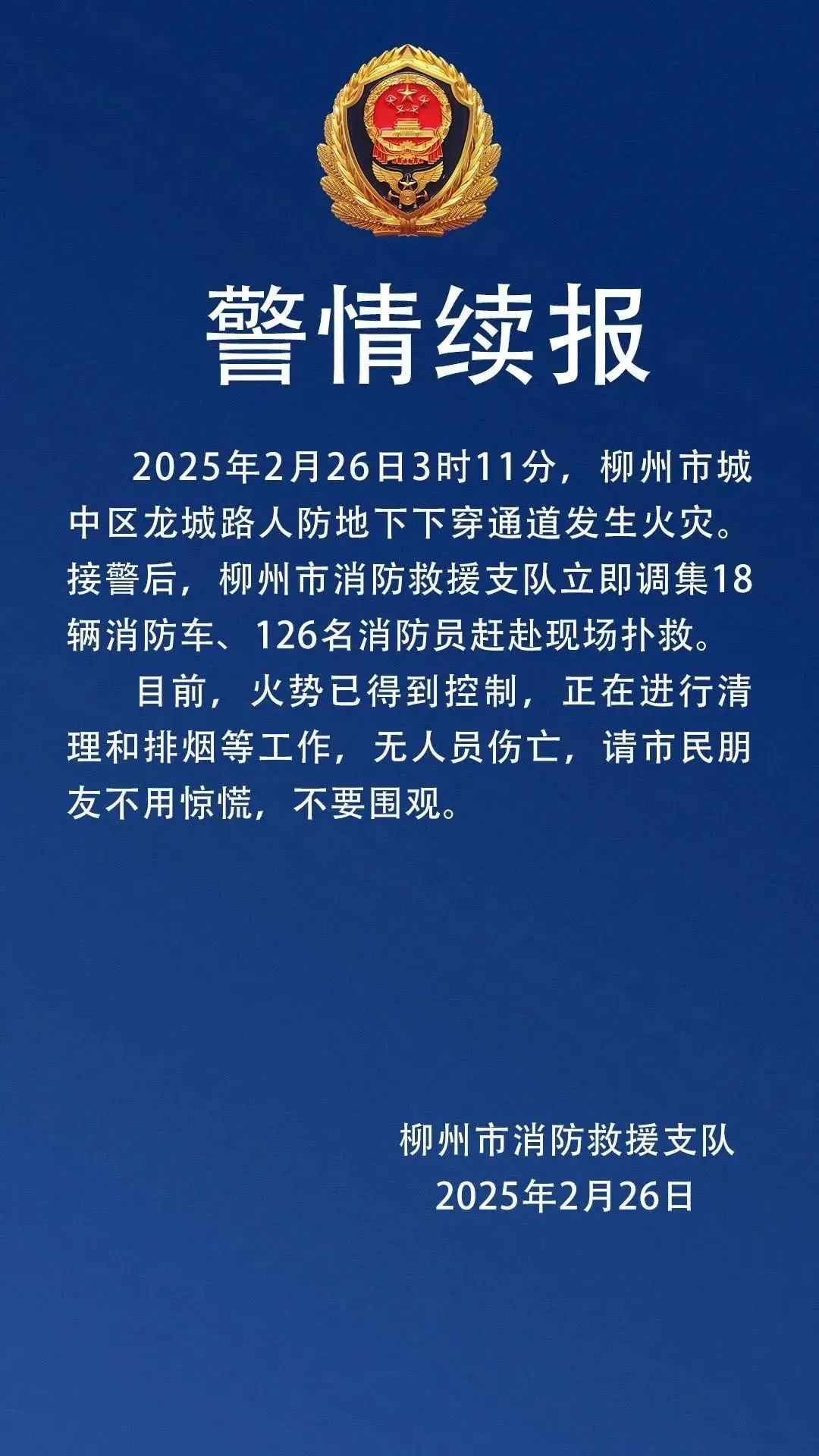 2025年2月26日凌晨3時,廣西柳州城中區龍城路地下商業街發生火災,三個地下下穿通道均被燒着,火苗衝出近三米高。