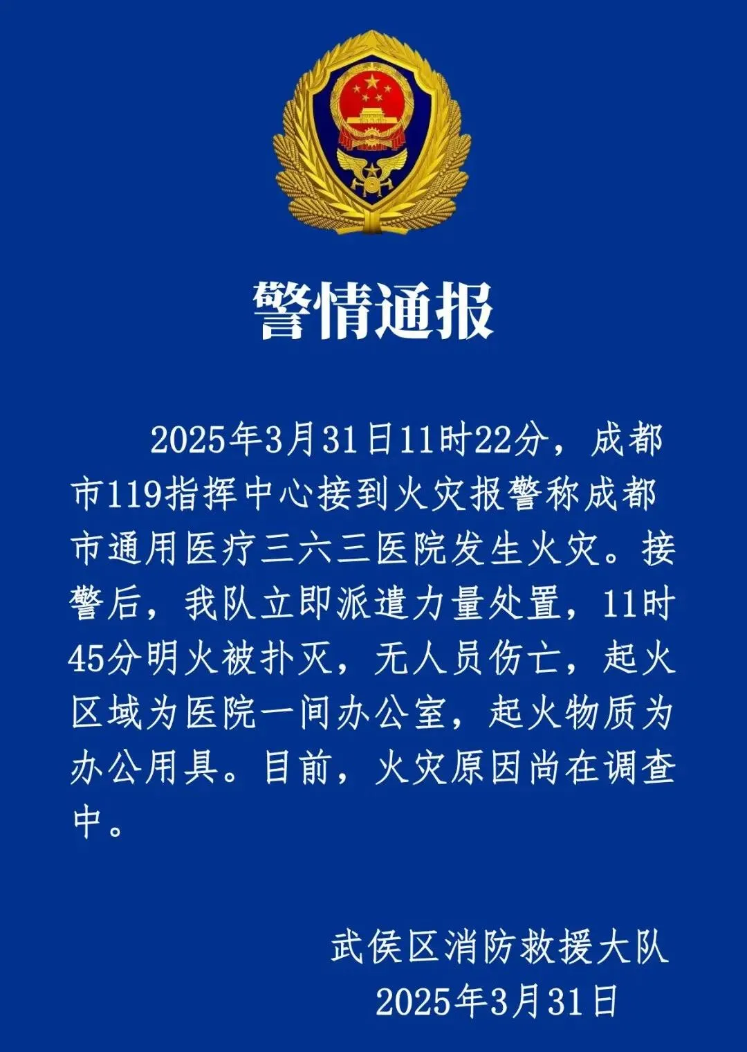 2025年3月31日11時許,四川省成都市通用醫療三六三*醫院發生火災。*起火區域為醫院一間辦公室,起火物為辦公用具。目前,火災原因尚在調查中。