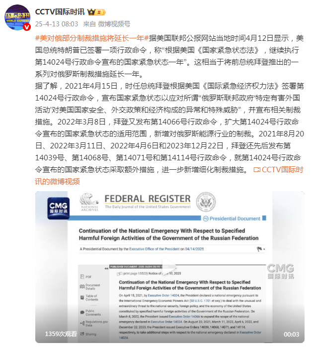 據美國聯邦公報網站當地時間4月12日顯示,美國總統特朗普已簽署一項行政命令,稱“根據美國《國家緊急狀態法》,繼續執行第14024號行政命令宣佈的國家緊急狀態一年”。這相當於將前總統拜登推出的一系列對俄羅斯制裁措施延長一年。