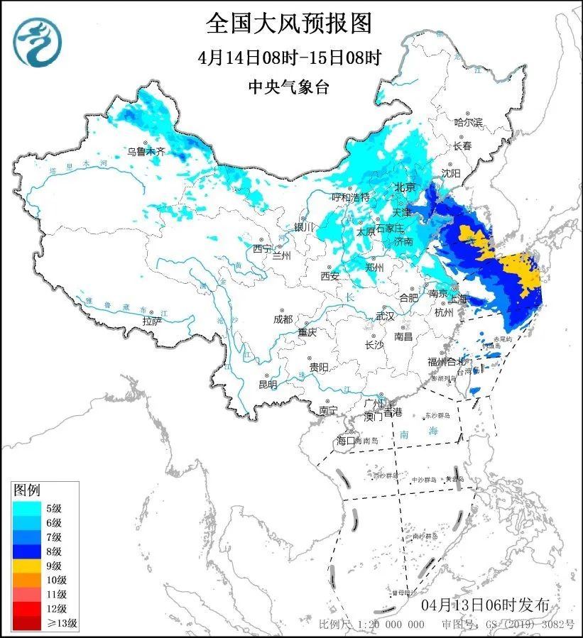 4月14日8時至15日8時,內蒙古中部、華北北部和東部、黃淮東部、江淮東部、東北地區南部以及新疆北疆等地有5~6級大風,陣風7~9級,其中,新疆北疆北部、河北北部、北京西部山區、山東半島等地局地陣風可達9~10級;渤海、渤海海峽、黃海大部海域、東海大部海域將有7~8級、陣風9~10級的大風,其中黃海中部和南部的偏東海域、東海東北部海域風力可達9級、陣風10~12級。