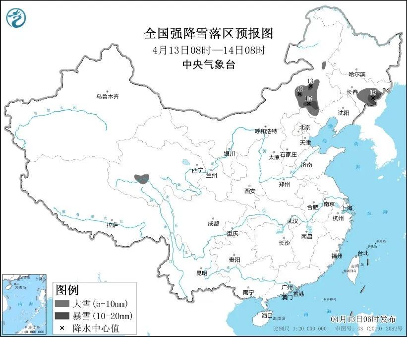 預計4月13日8時至4月14日8時,內蒙古中東部、吉林東部山區、青海南部等地部分地區有大雪,局地有暴雪(10~18毫米);上述地區新增積雪深度3~8釐米,局地可達15釐米左右。