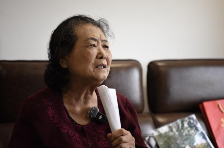 採訪中,陳明月老人把紙捲成“麥克風”向記者演唱《康定情歌》。新華社記者宿亮攝